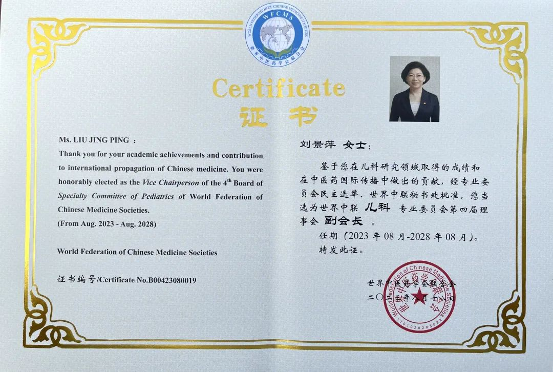 尊龙凯时药业集团党委书记、董事长刘景萍当选世界中医药学会联合会儿科专业委员会第四届理事会副会长